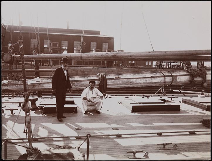 Two men, one standing and one sitting on the yacht "Valkyrie" docked at an unnamed pier.