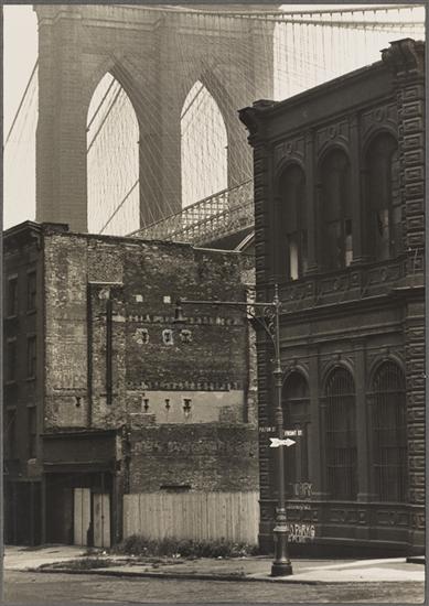 Untitled [Brooklyn Bridge seen from between tenement buildings.]