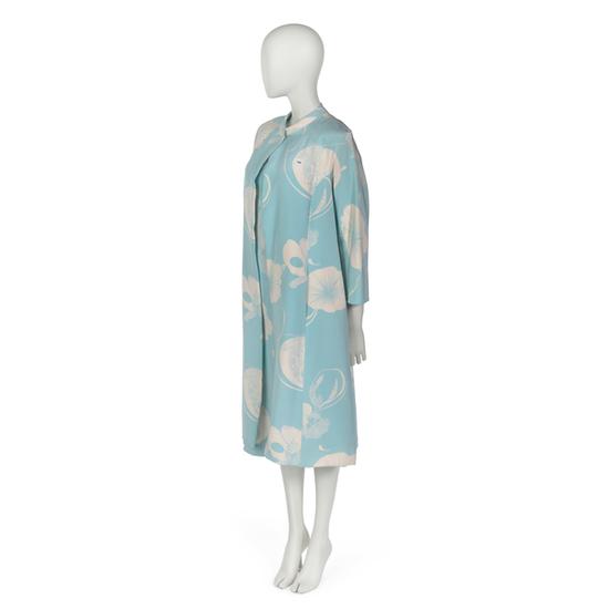 Evening ensemble comprising evening dress and coat in ice blue silk gazar