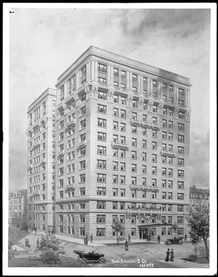 West 70th Street at the corner of Central Park West. The Lorington Apartments, watercolor rendering by Hughson Hawley, 1903.