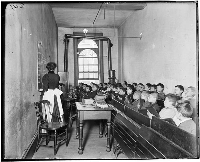 East Side Public Schools 1. A class in the condemned Essex Market School, Gas burning by day.