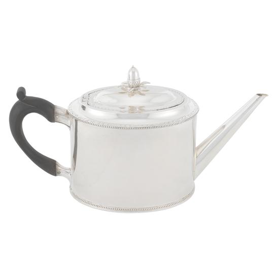 Teapot with seamed elliptical body, concave shoulders, slightly domed hinged cover, cast acorn finial with leaves, straight seamed spout, wooden scroll handle pinned into silver sockets (one pin in lower socket replaced), applied beading at shoulder and base, bright-cut wreath engraved on outer shoulder edge and basket of flowers engraved on cover and body to conceal hinge (old repair to base).