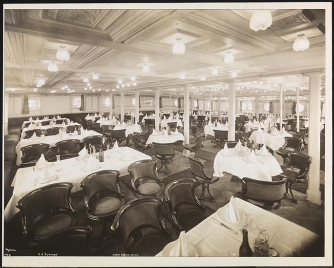 French Line, S.S. "Cuba" Pier 57 North River, Second Class Intermediate, Interior, Dining Room.