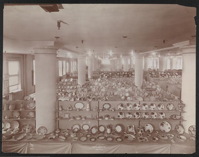 Interior of George Borgfeldt & Co. store; tables full of tableware including plates, cups and saucers, serving dishes, etc.