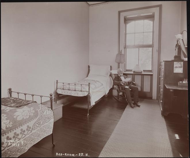 A man in a rocking chair in a bedroom at Sailor's Snug Harbor, a facility and home for retired sailors on Staten Island, New York.
