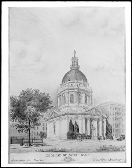 114th Street and Morningside Avenue. Notre Dame Church, watercolor rendering.