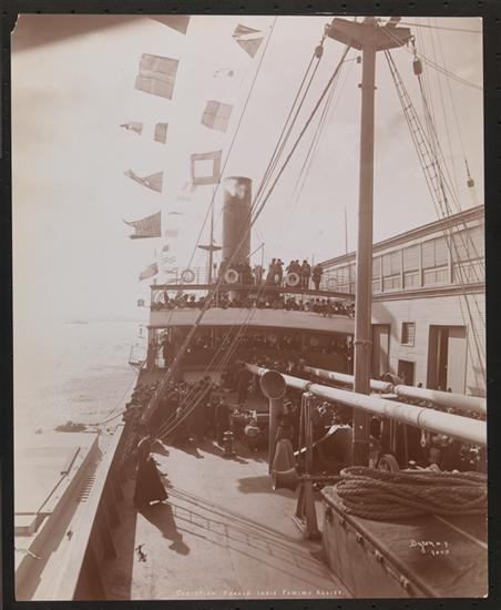 Description Christian Herald (journal) famine relief ship, the S.S. Quito, docked at a New York pier with crowd of well-dressed people aboard.
