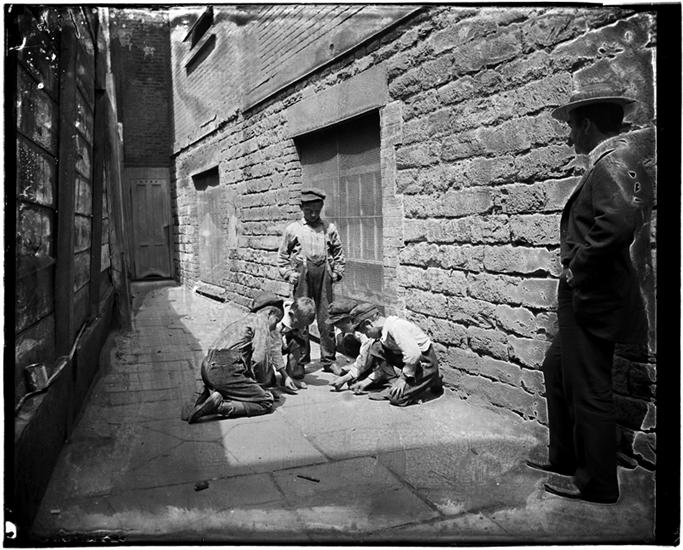 "Shooting craps" in the hall of the Newsboys' Lodging House.