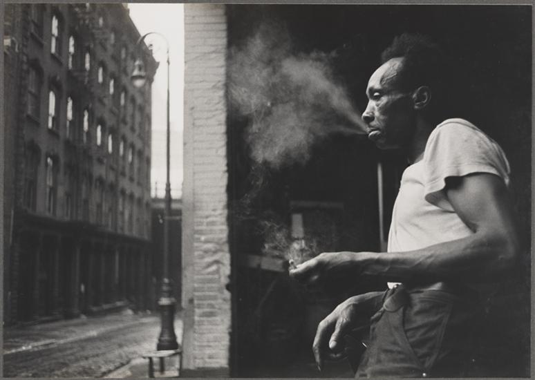 Untitled [Man sitting on a stoop with the Brooklyn Bridge in the distance.]
