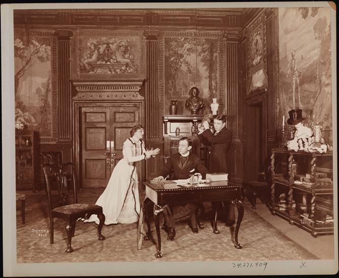 A scene from the New York production of Fabrice Carre and Paul Bilhaud's play "My Daughter-In-Law," featuring the Charles Frohman London Comedians including Herbert Standing, Seymour Hicks, Ferdinand Gottschalk, Fannie Brough, Josephine Gautier, and Ellaline Terriss.
