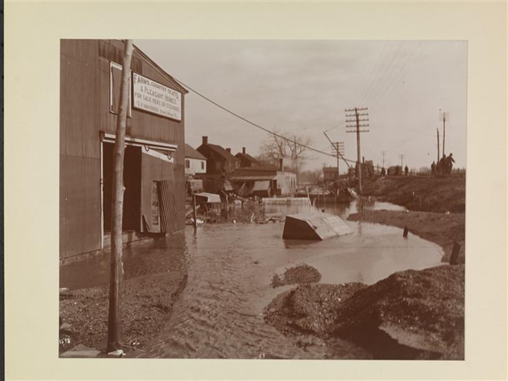 Flood waters at Bound Brook N.J. with sign reading "Farms, Country Seats, & Pleasant Homes for Sale, Rent or Exchange, G.V. Vandoren, Bound Brook, N.J.".