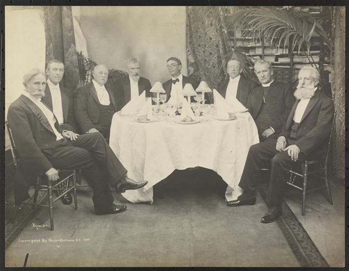 Eight men formally dressed, seated at a table at a dinner given to Arnold Bennett, novelist and dramatist, at Harper Brothers.
