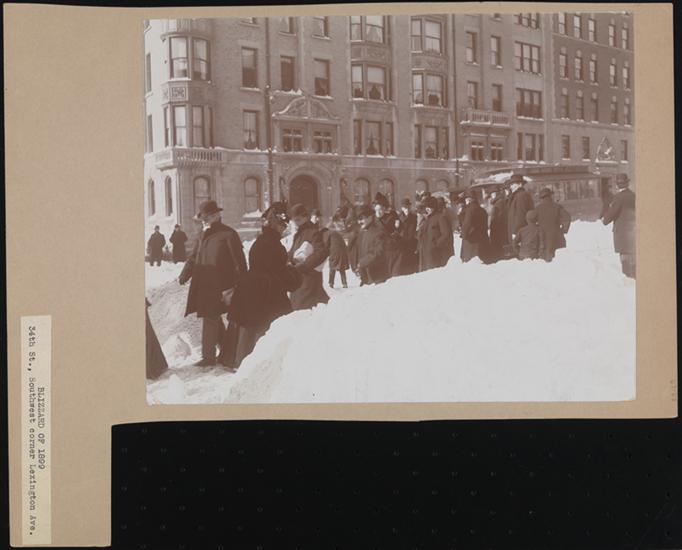 Crowd of pedestrians on snow-filled street at the southwest corner of Lexington Avenue and 34th Street.