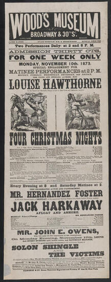 Monday, November 10, 1873, the young and sterling actress, Miss Louise Hawthorne, in the grand and beautiful picture of life in New York and California, entitled "Four Christmas Nights"