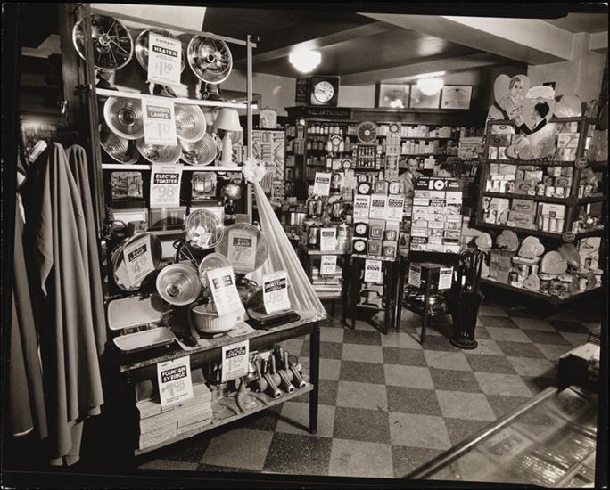 Westchester Avenue at the corner of Simpson Street. Riker's Drug Store interior.