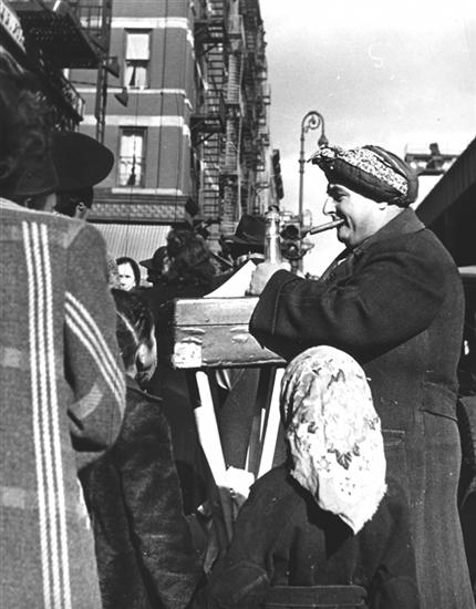 Untitled [Man in trench coat at crosswalk, near mailbox, Union Square]