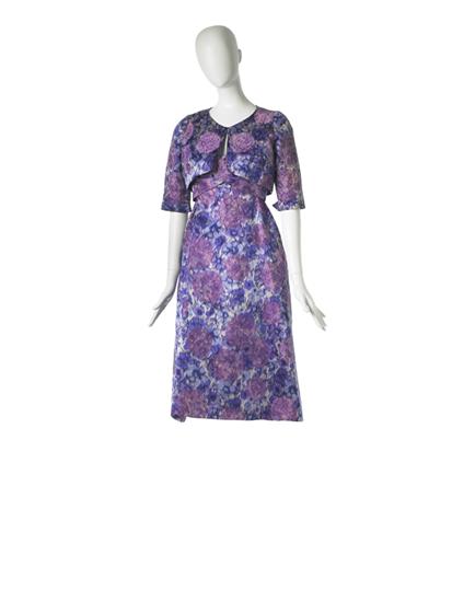 Evening dress in printed satin with matching jacket and belt