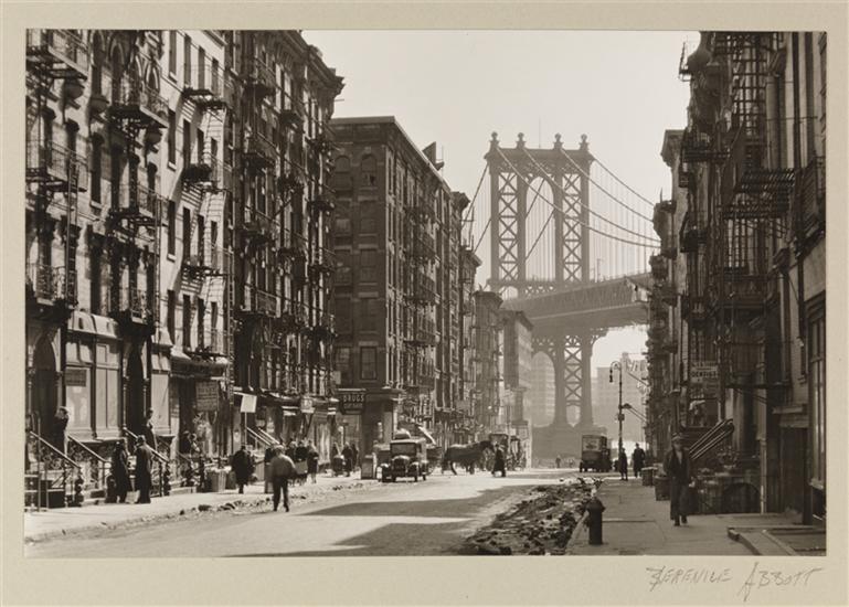 Description Pike Street between Henry and Madison Streets, showing tenements with the Manhattan Bridge in the background.