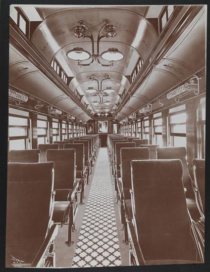 Drawing of the interior of an empty pullman passenger car.