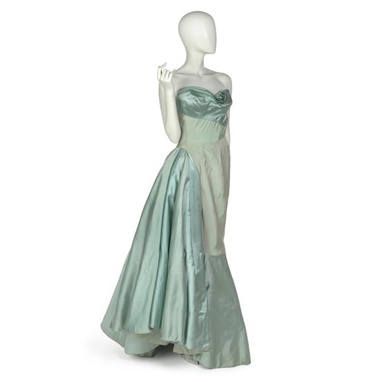 Strapless evening dress in pale blue silk moire taffeta