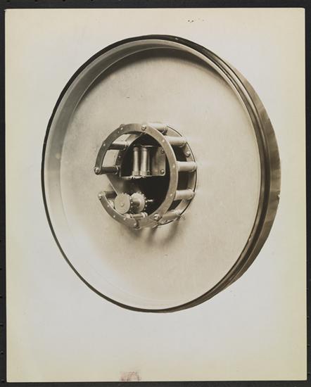 Description Internal workings of the "Feaster Film Feed Machine" for phonograph records, cut-out or masked to produce a blank background.