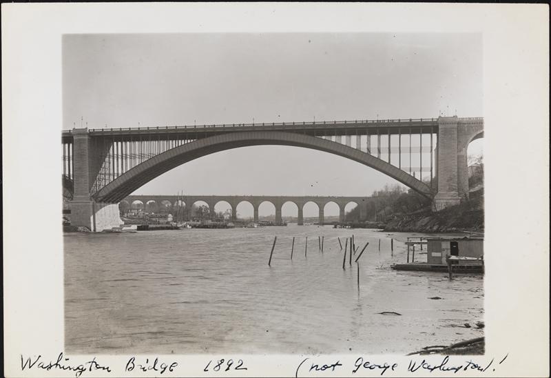 The Hudson River looking north from below the George Washington Bridge. Showing railroad tracks and the George Washington Bridge.