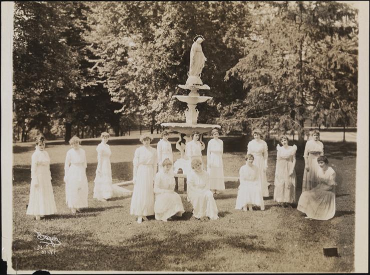 Class of female students posed on a lawn in front of a Virgin Mary fountain at the Academy of Mount St. Vincent, Riverdale.