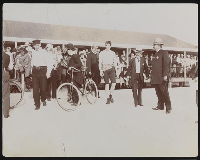 [Jim Corbett at Manhattan Beach Bicycle Track.]