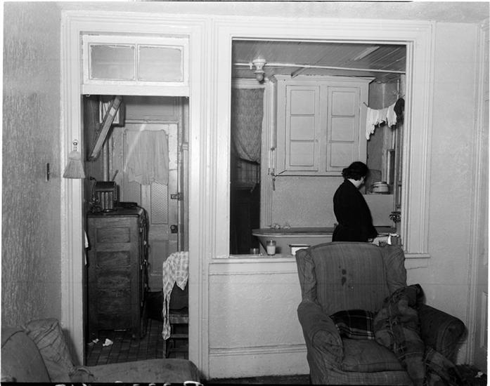Kitchen Interior, Woman Ironing and Man with Small Child