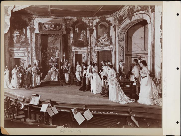 A scene from Act I of J.I.C. Clarke's dramatization of Knight Tompkins play "Her Majesty, The Girl Queen of Nordenmark" presented at the Manhattan Theatre in 1900.