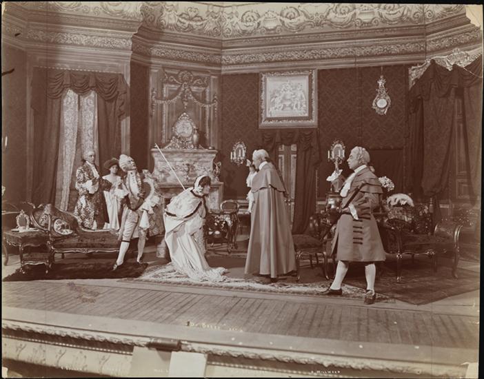 A scene from David Belasco's production of his play "Du Barry" featuring Mrs. Leslie Carter in the title role, presented at the Belasco Theatre, Broadway & 42nd Street, New York in 1902. Also pictured are Campbell Gollan as the Comte Jean Du Barry, possibly Irma Perry as Sophie, a maid, C.A. Steveson as King Louis XV, Herbert Millward as Lebel, confidential valet to His Majesty.