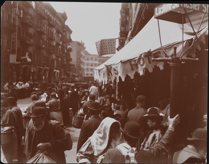The crowd shopping at push-carts and storefronts on Hester Street, corner of Ludlow Street.