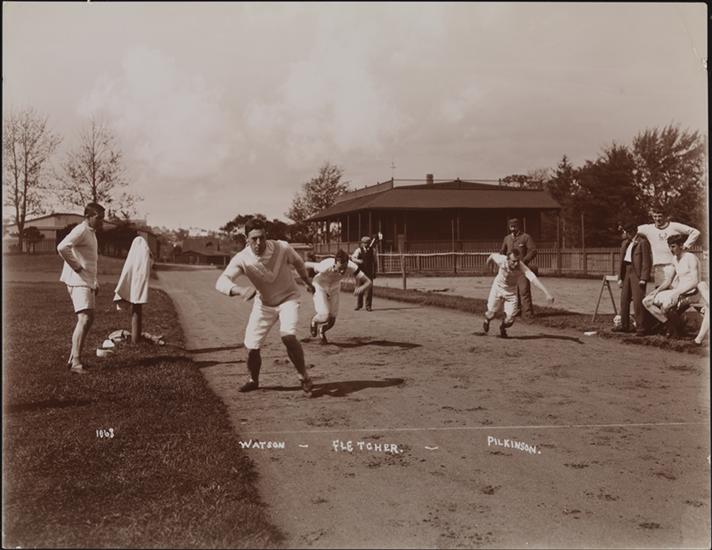 Track and field athletes at the Oxford and Cambridge training session at the Berkeley Oval, New York.