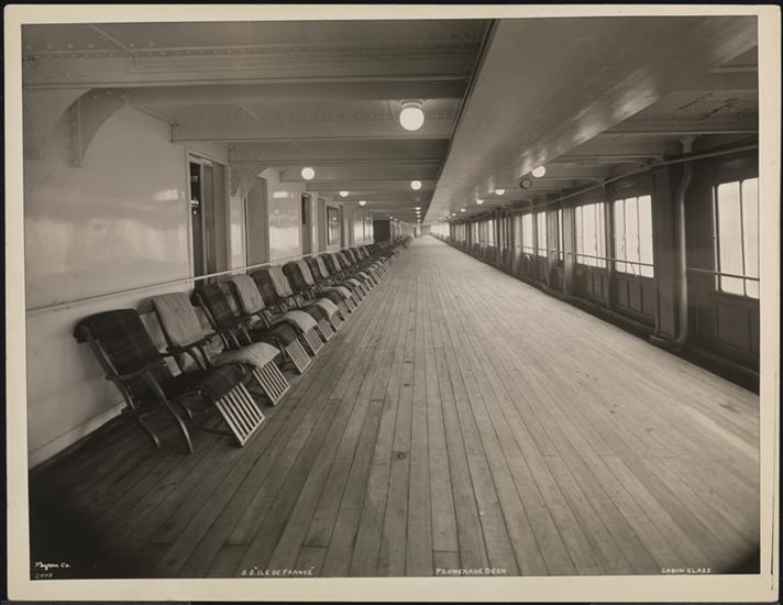 French Line, S.S. "Ile de France", First Class, Exterior, Promenade Deck with Models.