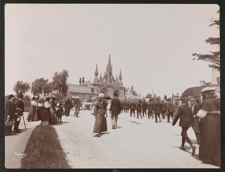 Crowd at Greenwood Cemetery on Decoration Day, 1899. With large gothic revival structure and monuments.