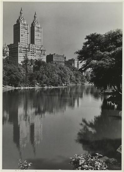 New York City views. Framed foreground of vertical reflection of Majestic Apartments [sic].