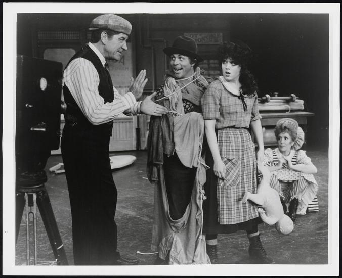 [Lisa Kirk as Lottie Ames, Robert Preston as Mack Sennett and Bernadette Peters as Mabel Normand in "Mack & Mabel".]