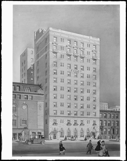 92nd Street and West End Avenue. Watercolor, rendering by Brigden, of apartment house.
