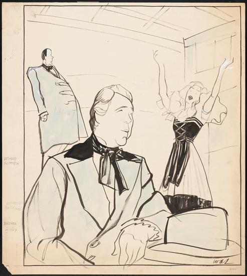 [Dorothy Sarnoff as Rosalinda Von Eisenstein, Edwin Fowler as Aide de Camp and Oscar Karlweis as Prince Orlofsky in "Rosalinda".]