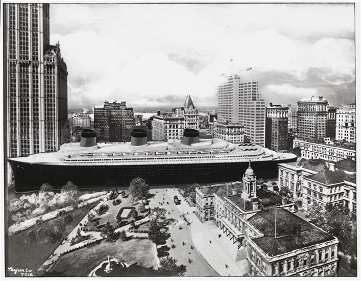[Photomontage of an Ocean Liner on an Aerial View of Central Park South.]