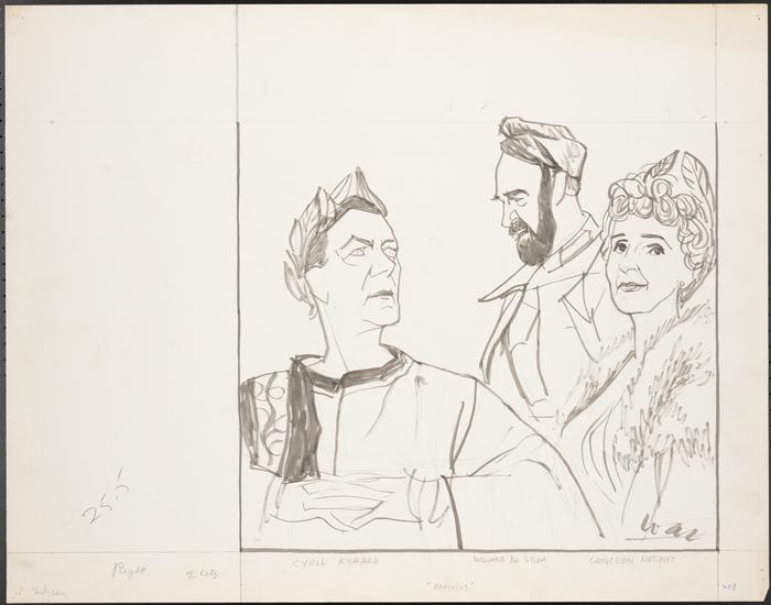 [John Gielgud as Valentine, Pamela Brown as Angelica, and Cyril Ritchard as Tattle in "Love for Love".]