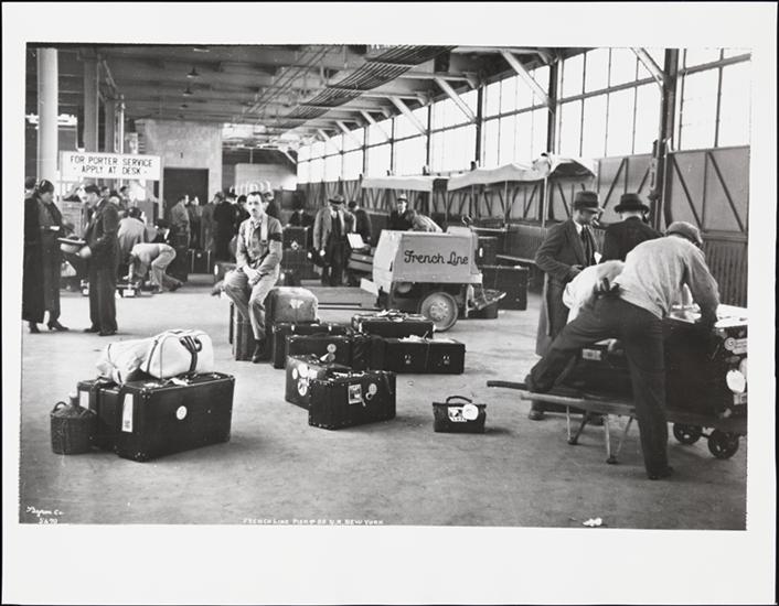 French Line, 610 Fifth Ave., "Normandie" Leaving Pier #88 N.R., Pier Scenes, Custom Inspection of Baggage.