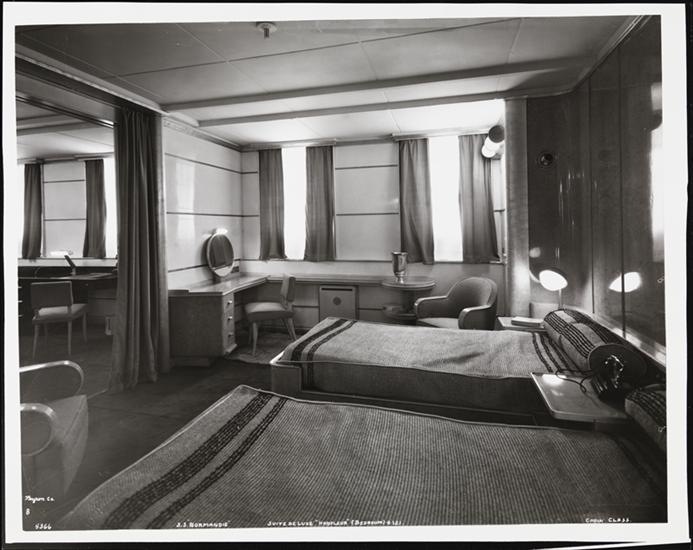 [S.S. "Normandie", Suite de Luxe "Bayeux" (Bedroom) #185, Cabin Class.]