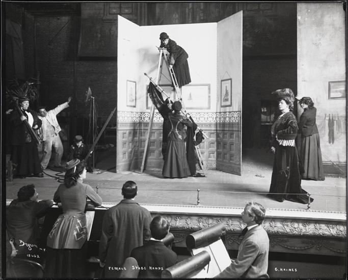 Description A staged photograph of female stage hands seting up the flats and dressing of a box set on the stage of an unidentified theater. Their supervisor stands on stage looking on their work.