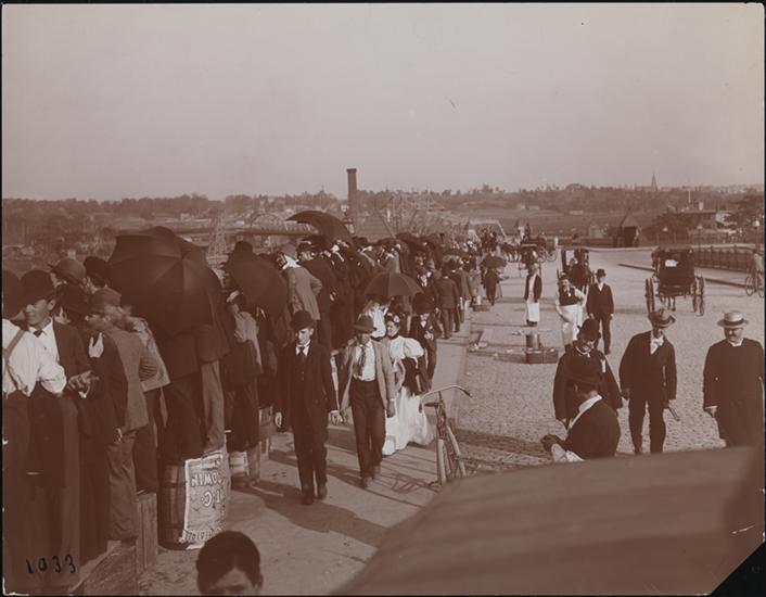 Spectators crowd on the Harlem River bridge overlooking Manhattan Field.
