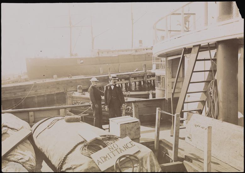 Description Two men standing aboard one of the yachts. A "No Admittance" sign is visible.