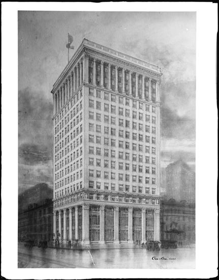 4th Avenue at the S.E. corner of 18th Street. Building, rendering by Hughson Hawley, 1909.