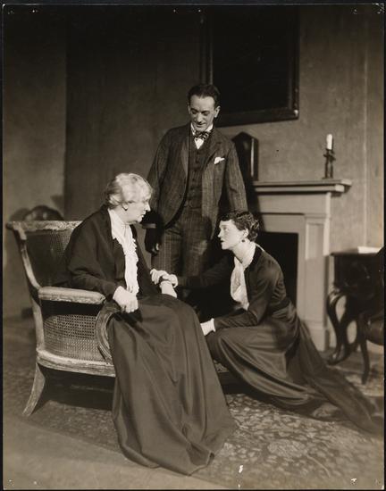 [Eva Le Gallienne as Hedda Tesman, Paul Leyssac as George Tesman, and Donald Cameron as Eilert Lovborg in "Hedda Gabler".]