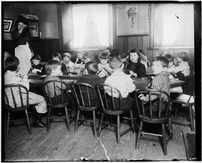 King's Daughters Tenement Chapter, threading beads in the kindergarten.