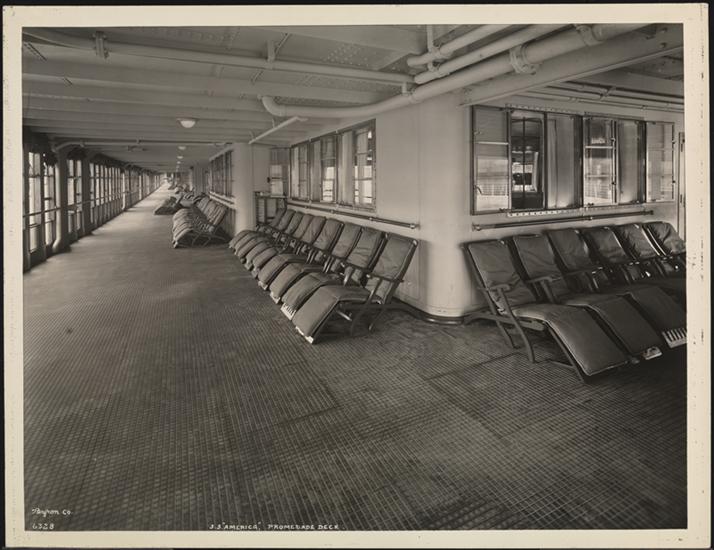 United American Lines, S.S. "Hamburg", Pier 86 North River, First Class Promenade Deck Looking Forward.